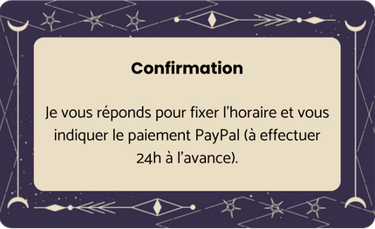 Le paiement s’effectue à l'avance par PayPal, à confirmer lors de la prise de rendez-vous (24h à l’avance).